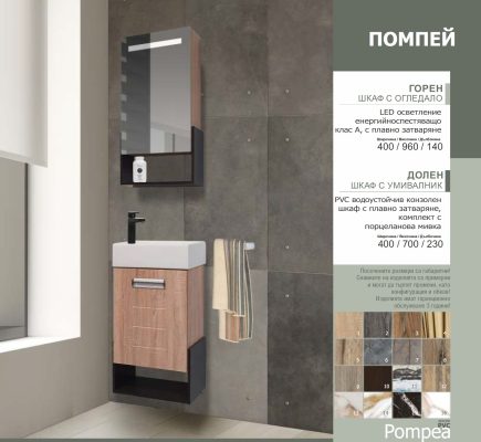 Серия Помпей включва Горен шкаф с огледало с LED осветление и долен шкаф с умивалник
