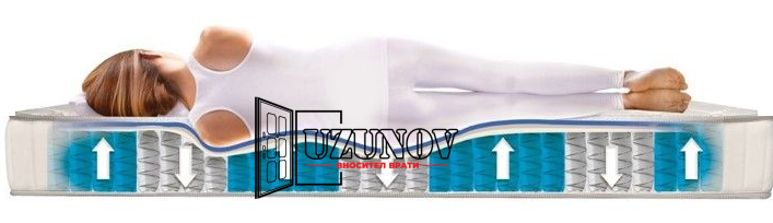 - Ядро – 7 зоново ядро, от мулти покет система от индивидуално пакетирани пружинки – ортопедична опора, добавени са и 2-два слоя висока еластична пяна, както и допълнителен слой 2см. Мемори пяна в прошивкатаа на матрака от едната страна ;