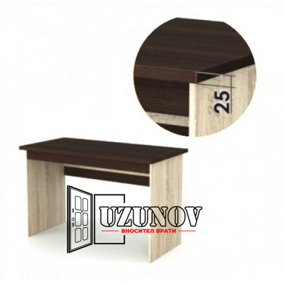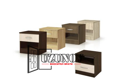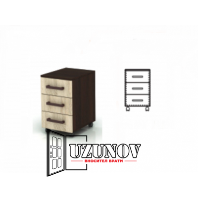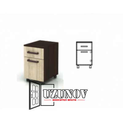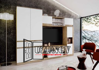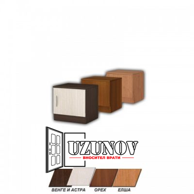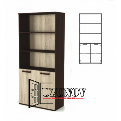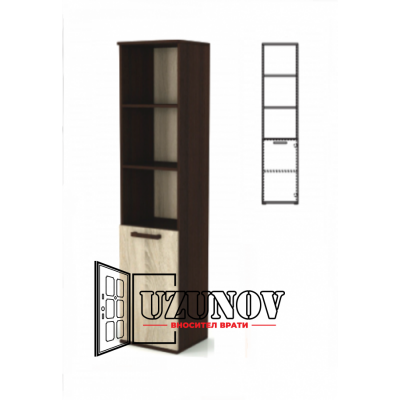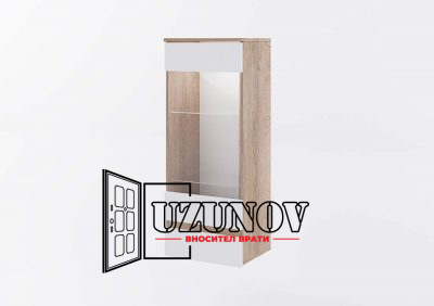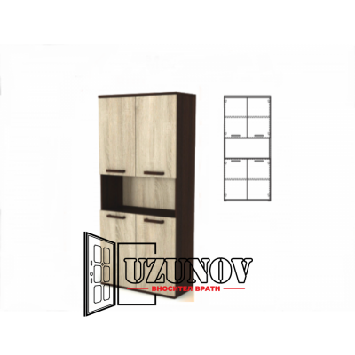 Шкафът разполага с две врати, едната с витрина с по три рафтчета.