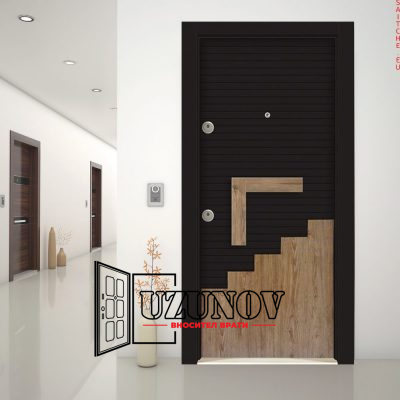 - Обков, включващ: иноксова сатенирана подвижна дръжка за вътрешната страна на вратата и по избор подвижна или пасивна дръжка за външната страна , шпионка с метално чукче; панти;