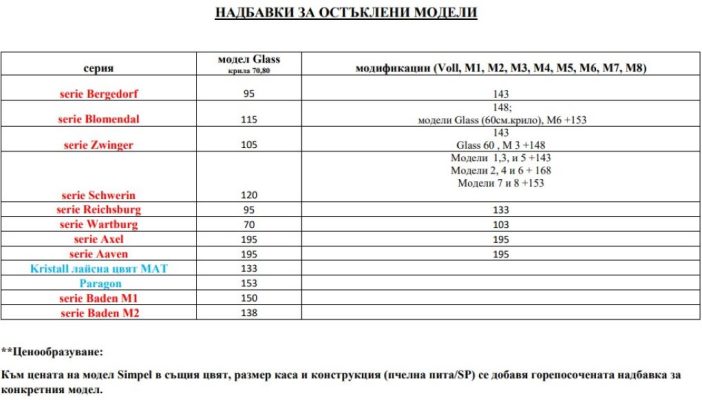 Подробни цени в светли цветове и тъмни цветове с регулируема каса СТАНДАРТ и регулируема каса ПАНЕЛ, за серия Bergedorf :