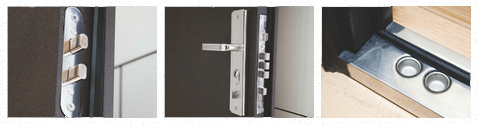 Комплекта включва: Крило, каса с первази за от едната страна, брава, патрон с пет ключа (плюс два броя-монтажни), иноксова дръжка, шпионка, гумени уплътнeния на крилото и на касата, четири броя вградени в касата панти и дюбели за монтаж.