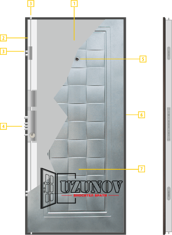Крилото е изработено от два листа ламарина и допълнително оребрено с метални профили, а между тях е поставена изолация тип „пчелна пита”, крилото е с дебелина 50 мм. или 70 мм. в зависимост от модела, с релефна повърхност и покритие с машинно поставено топло пренесено PVC фолио или е прахово боядисано, според модела входна врата. Пантите са скрити в касата. Посоки на отваряне : навътре/лява, навътре/дясна, навън/лява, навън/дясна.
